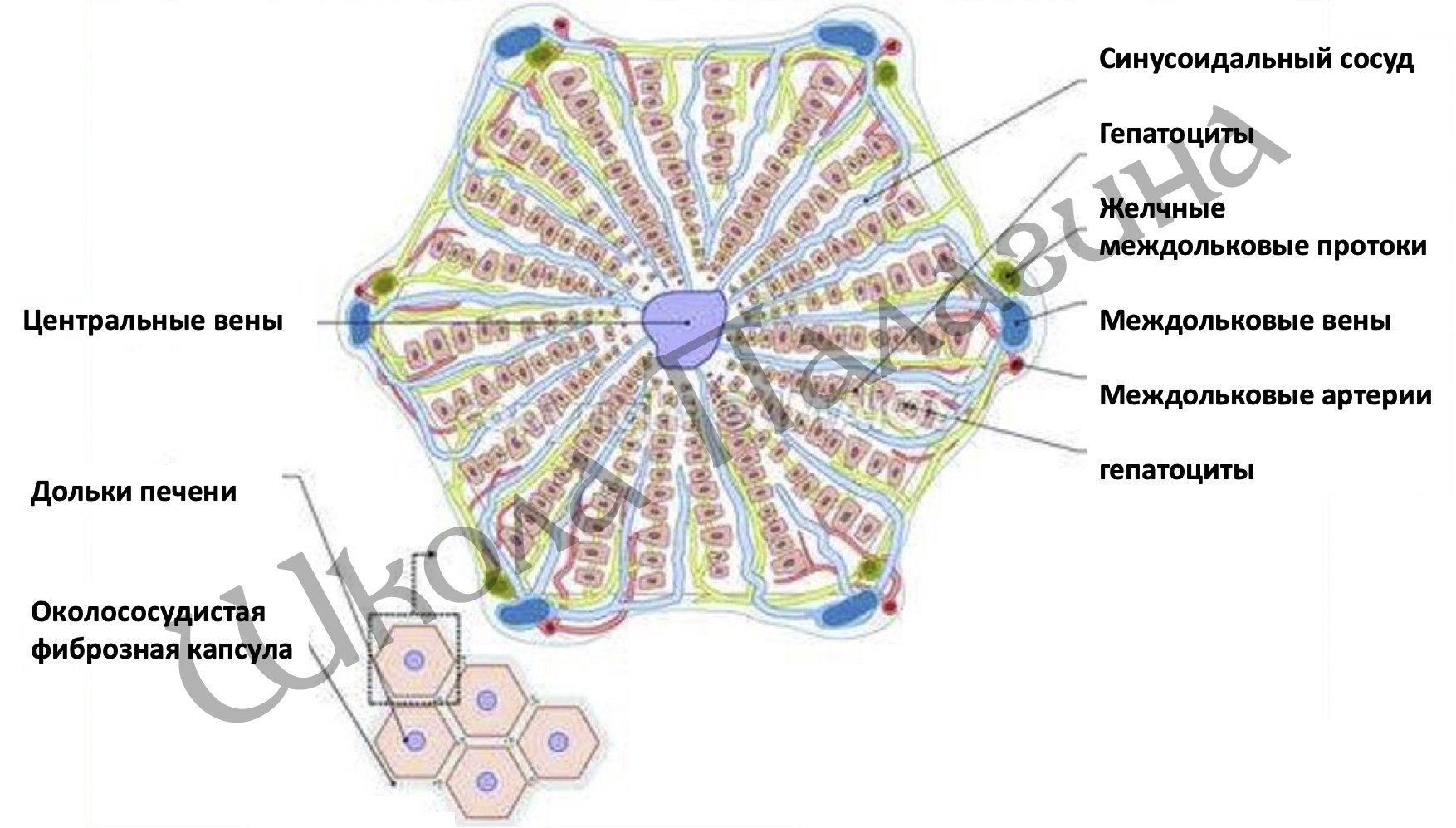 На рисунке СОВЕРШЕННАЯ, КРАСИВАЯ И ПРЕКРАСНАЯ печеночная долька. Шестигранник, идеальная форма «сатурническая». Сатурн — символизирует шестигранник, очень многие молекулы шестигранны. Например бензольное кольцо шестигранно. В органической химии очень много шестигранных молекул и кристаллов.