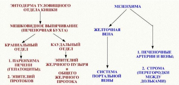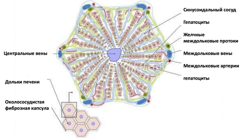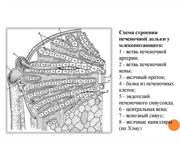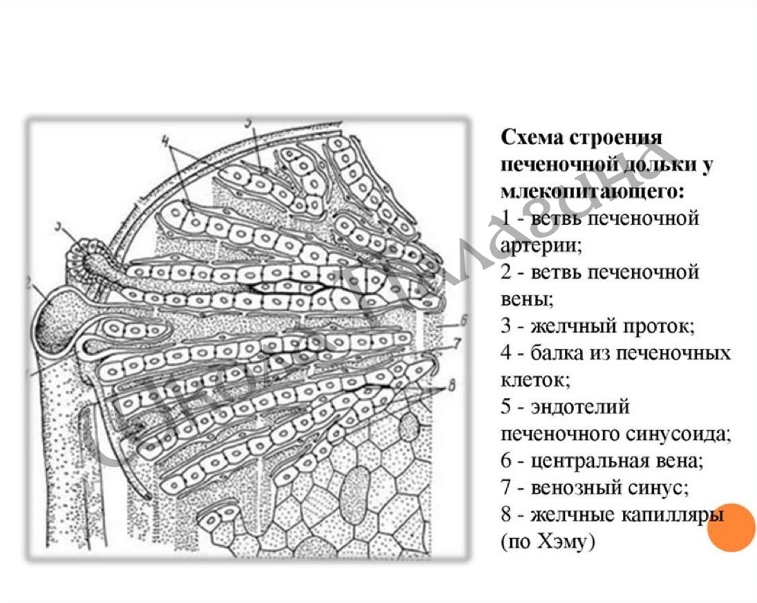 Схема строения печеночной дольки у млекопитающего: