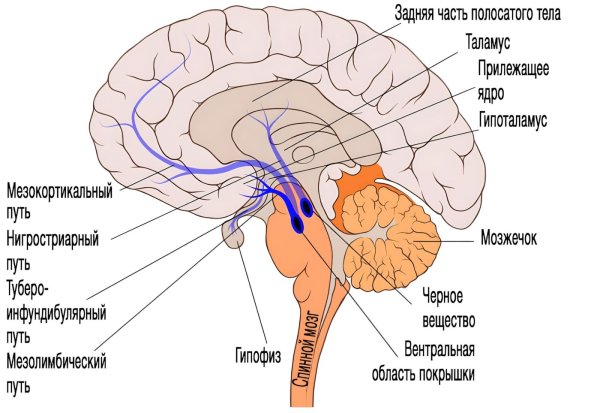 - Мезокортикальный путь (от гипоталямуса в кору) — процессы мотивации и эмоциональные реакции