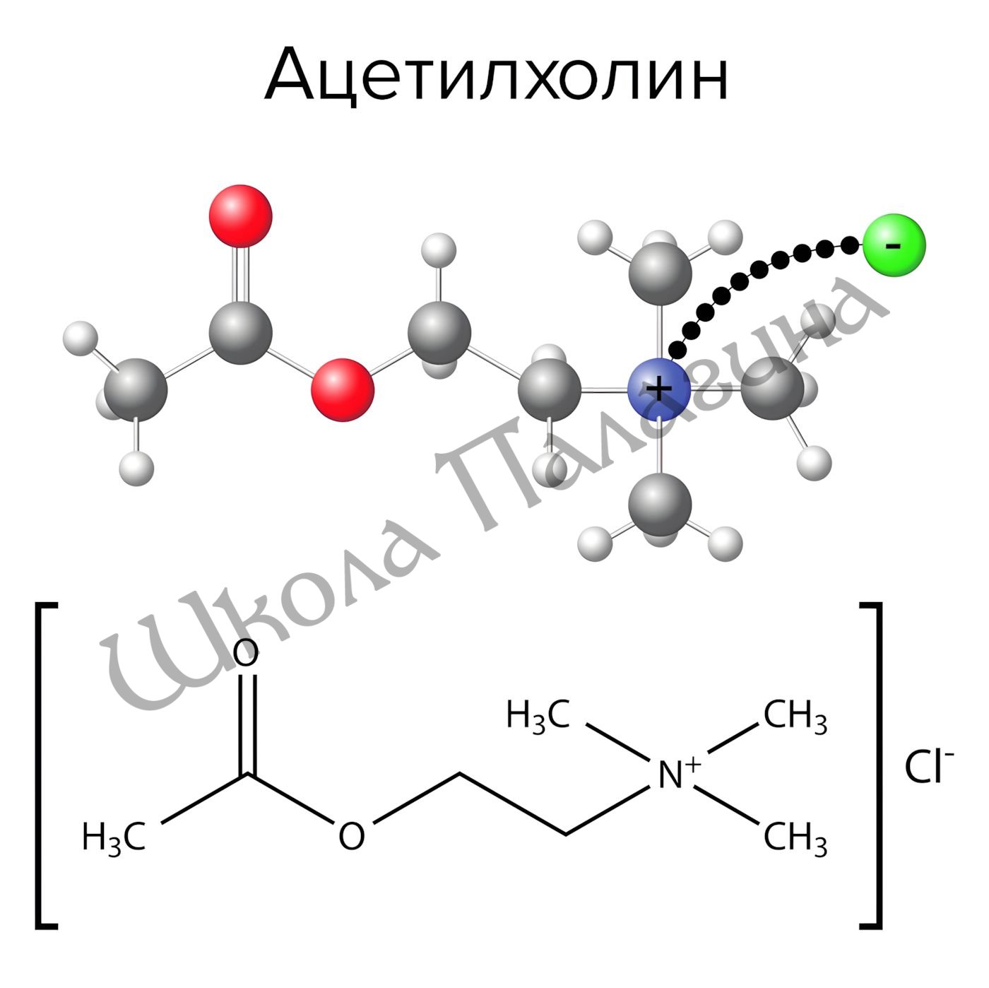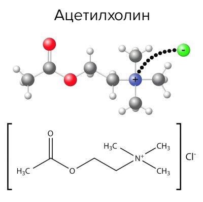 Ацетилхолин — органическое соединение, производное холина — нейромедиатор, осуществляющий нервно-мышечную передачу, а также основной нейромедиатор в парасимпатической нервной системе. В организме очень быстро разрушается ферментом — ацетилхолинэстеразой, который играет важнейшую роль в таких процессах, как память и обучение. Физиологическое холиномиметическое действие ацетилхолина обусловлено стимуляцией им мембран М- и Н-холинорецепторов. Действие ацетилхолина проявляется в замедлении сердечных сокращений, расширении периферических кровеносных сосудов и понижении артериального давления, усилении перистальтики желудка и кишечника, сокращении мускулатуры бронхов, матки, желчного и мочевого пузыря, усилении секреции пищеварительных, бронхиальных, потовых и слёзных желез, в сужении зрачка.